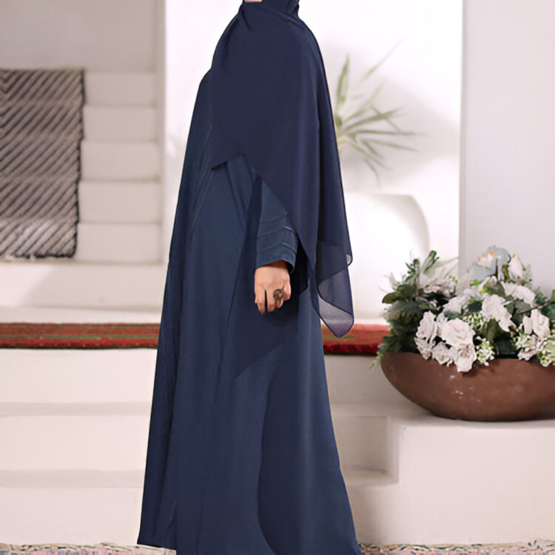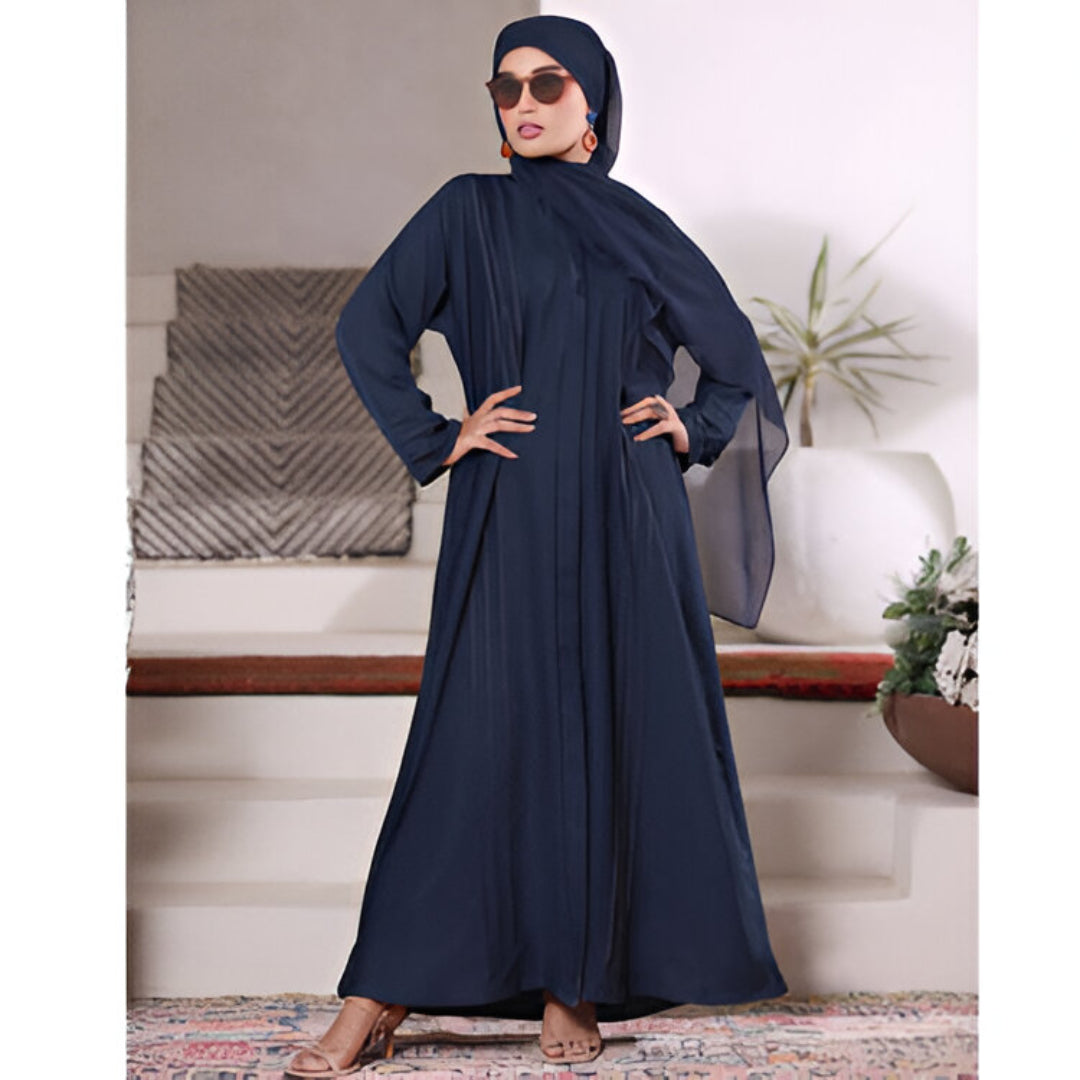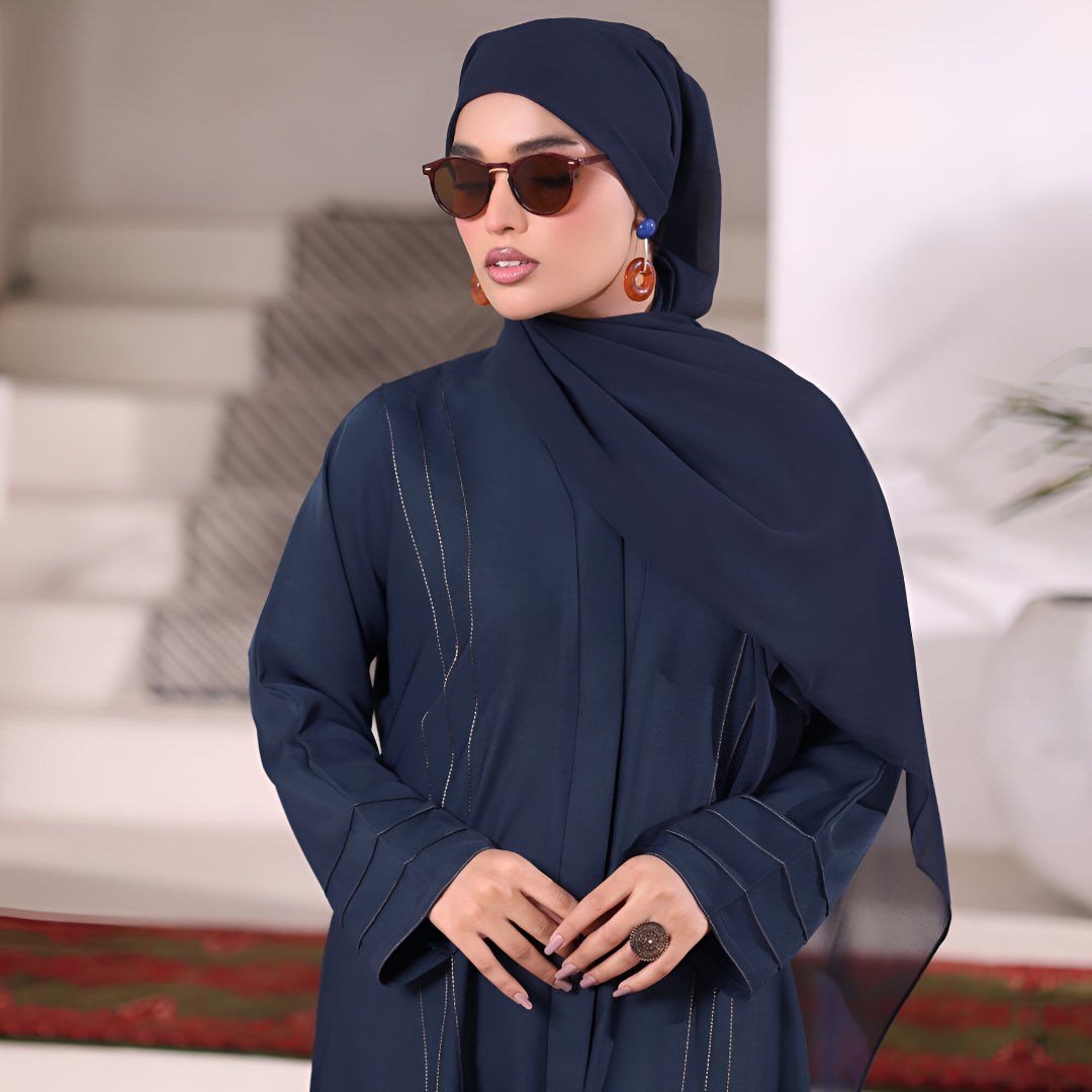 Experience effortless elegance with this navy blue abaya, tailored from premium Nidha fabric known for its soft texture, lightweight feel, and graceful fall. The abaya features delicate vertical stitch detailing on the front and sleeves, adding a refined touch while maintaining a modest, timeless look.