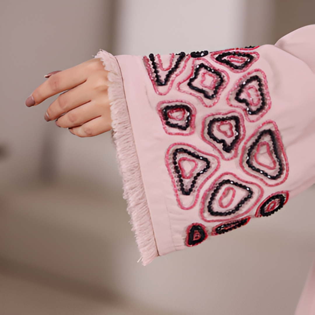 Embroidery: Unique geometric embroidery on the sleeves with black and pink threadwork