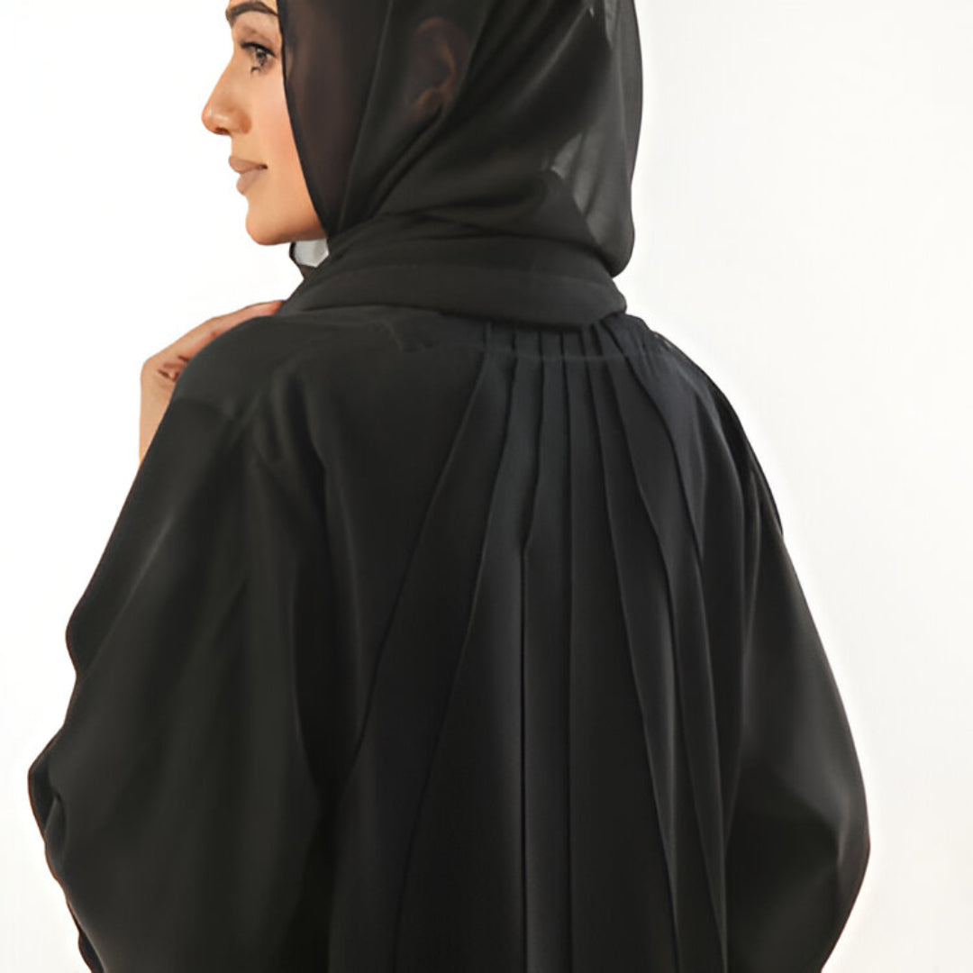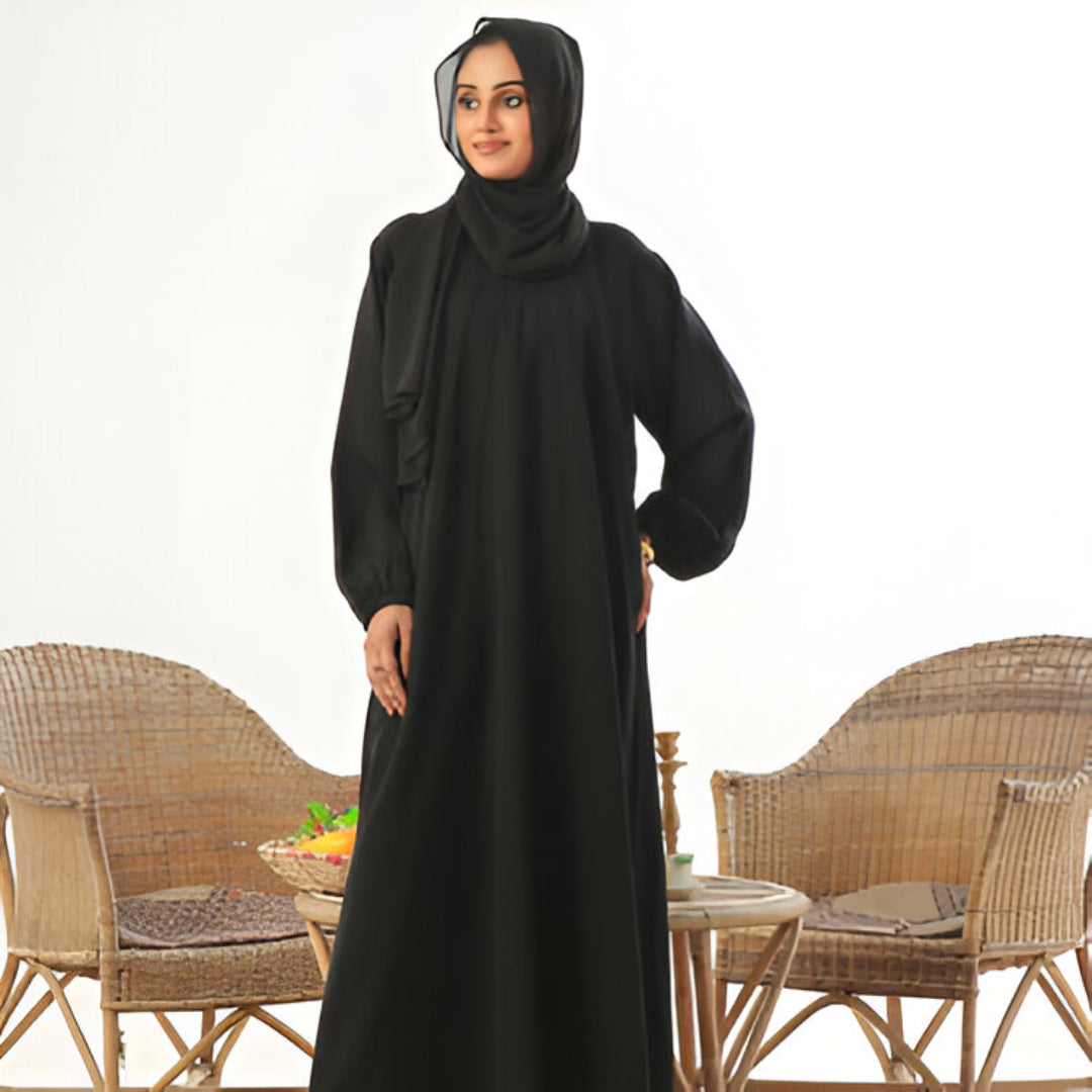 This abaya is an essential addition to your wardrobe, offering an effortlessly chic and sophisticated look. Its maxi-style silhouette is enhanced with delicate piping details along the front, adding a refined touch of elegance. Featuring loose, flowing sleeves for a graceful appearance, this abaya is paired with a pure Korean chiffon Sheila, completing the ensemble with a luxurious finish. Perfect for any occasion, this piece is one of our most sought-after designs.